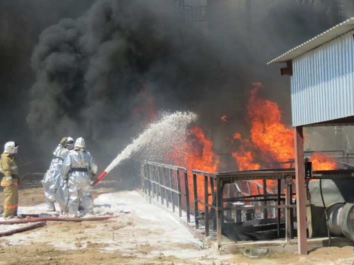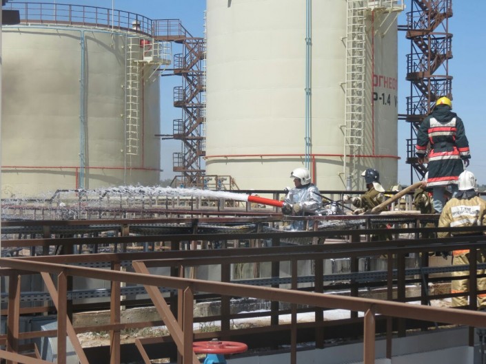 По данным КЧС МВД, пожарные проводят пенную атаку для тушения пожара на нефтебазе. Пенная атака производится одновременно всеми расчетными средствами. Пожар на двух цистернах потушен. Ликвидация продолжается.