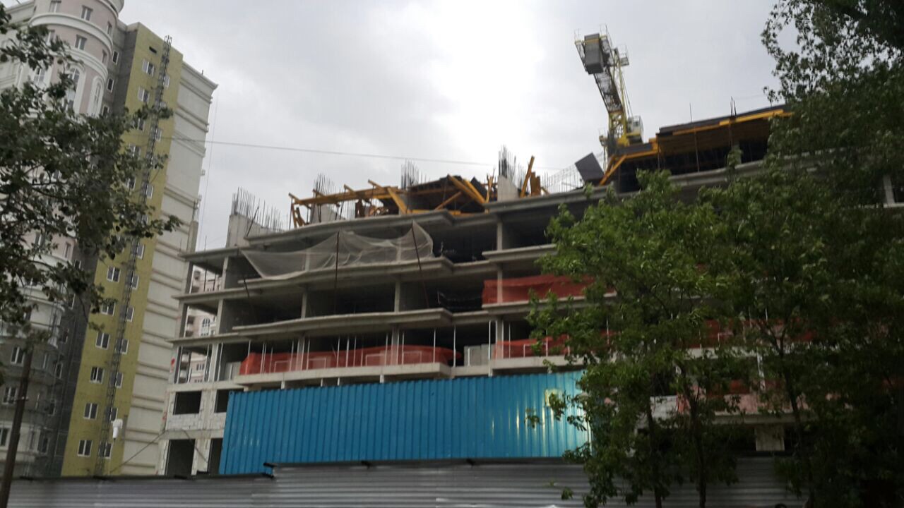 Последствия урагана на территории строящегося жилого комплекса, расположенного на улицах Навои и Торайгырова (бывшая Фрунзе).