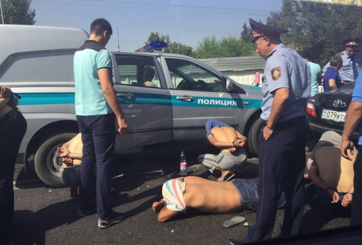 По словам очевидцев происшествия, полицейские задержали молодых людей прямо на проезжей части. На месте задержания находились три полицейские машины. В результате данного инцидента по проспекту Райымбека образовался автомобильный затор. Между тем движение транспорта не было перекрыто или ограничено полицейскими.