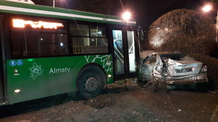 ДТП с участием пассажирского автобуса произошло в ночь с 16 на 17 ноября в Алматы, сообщает корреспондент программы "Территория происшествий" на телеканале СТВ.