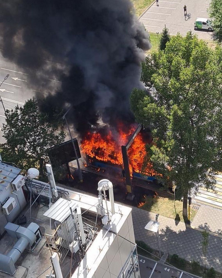 "4 июня в 14:47 на пульт ДЧС поступило сообщение от очевидца о горении автобуса. По прибытии пожарные установили, что открытым пламенем горит маршрутный автобус Yutong 2014 года выпуска. Топливная система автобуса на газе. Огонь успел перейти на рекламный щит", - сообщили в ведомстве.