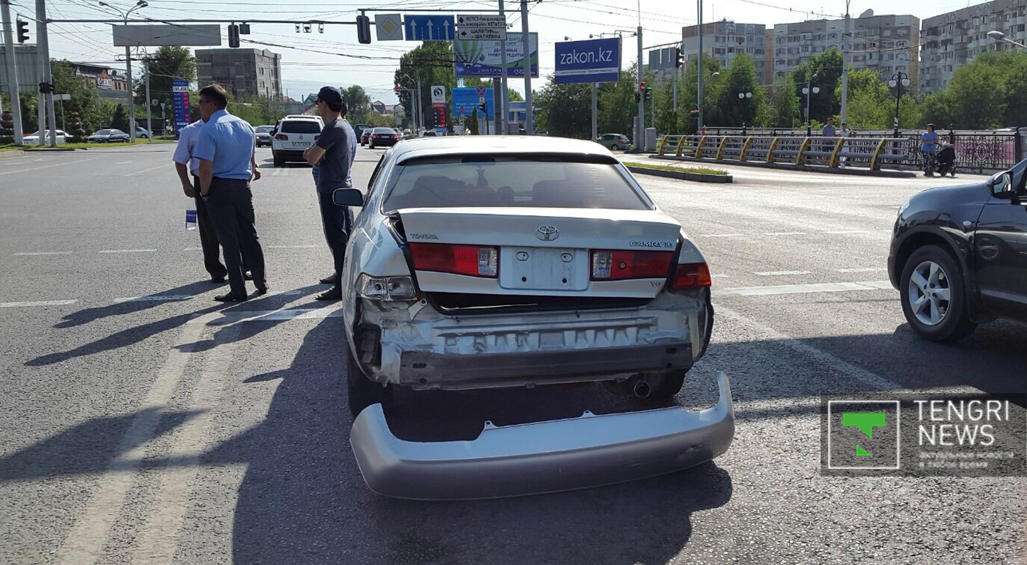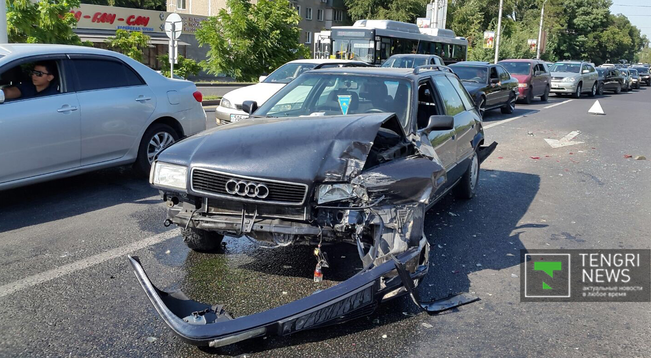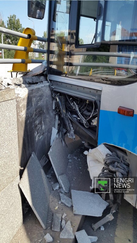После столкновения с Audi автобус пересек улицу Саина, снес разделительное ограждение, вылетел на встречную полосу движения, затем врезался в цветочную аллею, снеся бордюры. Затем, перелетев через арык, автобус врезался в опору моста развязки, едва не упав в тоннель.