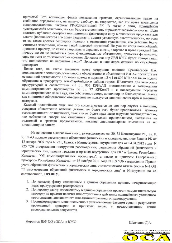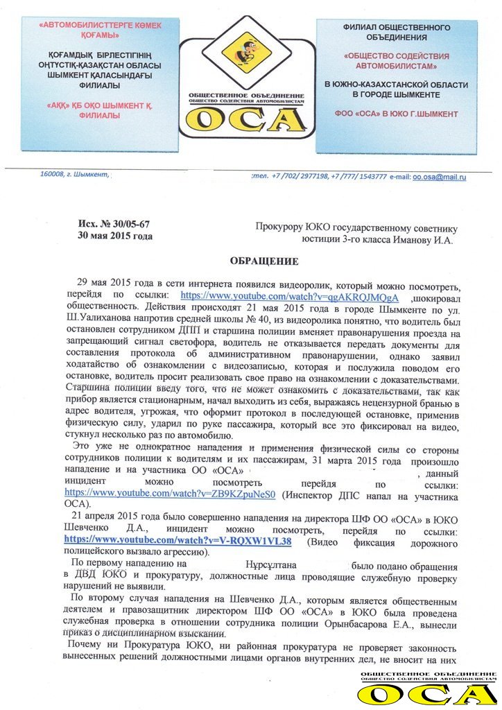 Позже стало известно, что директор филиала ОО "ОСА" в Шымкенте Денис Шевченко подал заявление на имя прокурора Южно-Казахстанской области о принятии мер к данному представителю правоохранительных органов. "Это уже не первый случай нападения и применения физической силы со стороны сотрудников полиции к водителям и их пассажирам", - говорится в обращении.