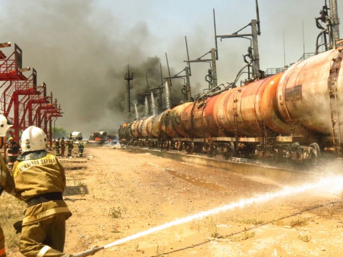 Возгорание на нефтебазе в ЮКО произошло из-за столкновения вагонов с цистернами. В момент столкновения с цистерн производили розлив. В результате загорелись 12 цистерн, три полувагона. Из-за распространения пожара была угроза возгорания 15 резервуаров. В 12.59 была обеспечена полная локализация пожара.