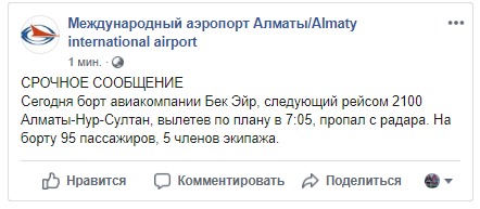 "Сегодня борт авиакомпании Бек Эйр, следующий рейсом 2100 Алматы - Нур-Султан, вылетев по плану в 7:05, пропал с радара. На борту 95 пассажиров, пять членов экипажа", - говорится в сообщении.