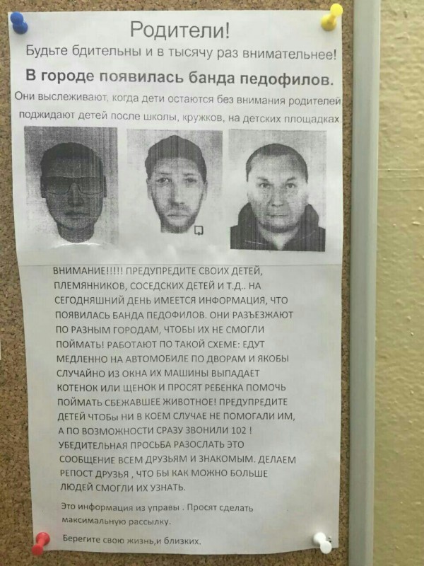 "Внимание!!! Предупредите своих детей, племянников, соседских детей и т.д. На сегодняшний день появилась информация, что появилась новая банда педофилов. Они разъезжают по разных городам, чтобы их не могли поймать! Работают по такой схеме: едут медленно на автомобиле по дворам, и якобы случайно из окна их машины выпадает котенок или щенок, и просят ребенка помочь поймать сбежавшее животное! Предупредите детей, чтобы ни в коем случае не помогали им, а по возможности сразу звонили 102! Убедительная просьба разослать это сообщение всем друзьям и знакомым. Делаем репост, друзья, чтобы как можно больше людей смогли их узнать (...)", - говорится в обращении.
