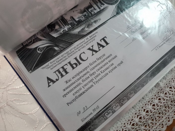 В фойе школы организовали уголок памяти. Рядом с фотографией Такирхана Абишева папка с многочисленными благодарственными письмами и грамотами за хорошую работу и победы в различных творческих конкурсах.