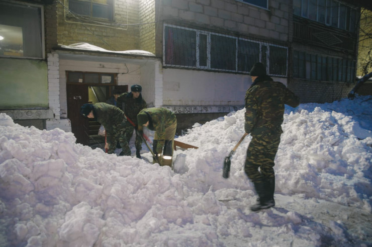 В 18.04 работы по очистке кровли от снега были завершены. Всего было убрано 288 кубометров снега.