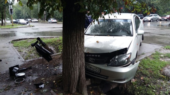 Автомобиль Toyota Camry снес светофор в результате ДТП в Алматы, передает корреспондент программы "Территория происшествий" на телеканале СТВ.