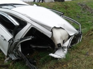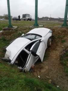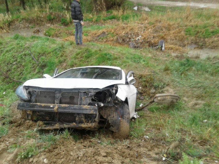 Автомобиль Hyundai выбросило с мокрой от дождя дороги прямо на железный столб. От удара машину разорвало пополам. Останки транспортного средства оказались метрах в 20 от трассы, задняя часть в арыке.