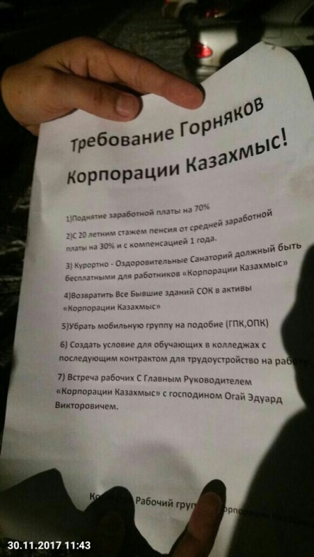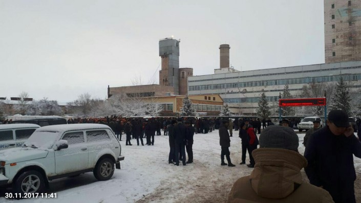 "30 ноября 2017 года возник трудовой спор между сотрудниками Южно-Жезказганского рудника и руководством ТОО "Корпорация "Казахмыс", город Сатпаев. Представители руководства акиматов области, города Сатпаев, руководство компании "Казахмыс" находятся на месте. Идет переговорный процесс. Ситуация находится под контролем. Официальное заявление будет сделано после завершения переговоров", - сообщили в пресс-службе акима Карагандинской области.