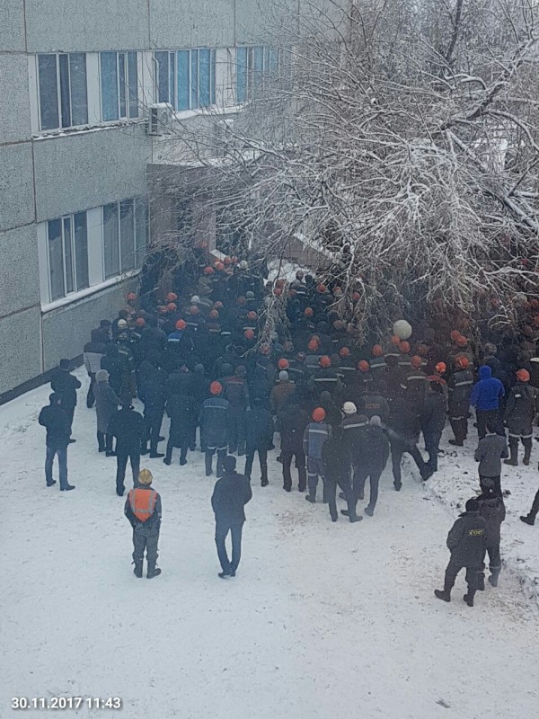 На видео, распространяемом очевидцами, запечатлены шахтеры, которые с раннего утра собираются на территории предприятия. Авторы видео сообщают, что горняки намерены таким образом добиться разговора с руководством компании.