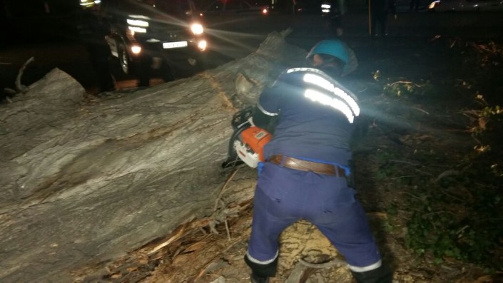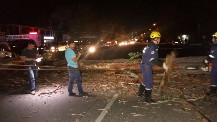 В Алматы упавшее от сильного ветра дерево упало на проезжую часть, повредило легковой автомобиль марки Renault и перекрыло движение. В результате падения тополя никто не пострадал, однако на дороге образовалась внушительная пробка. Об этом сообщает корреспондент программы "Территория происшествий" на телеканале СТВ.