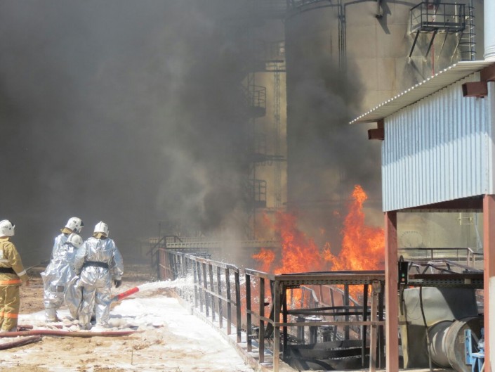 Пожарные проводят пенную атаку для тушения пожара на нефтебазе. Пенная атака производится одновременно всеми расчетными средствами. "Подготовка к пенной атаке проводится в максимально короткий промежуток времени, так как горение и выделяемая температура оказывает значительное влияние на тушение пожара пеной. Кроме того, увеличение времени горения повышает опасность распространения пожара на соседние резервуары, а также опасность вскипания и выброса нефти и других темных нефтепродуктов", - сообщил официальный представитель КЧС МВД РК Руслан Иманкулов.