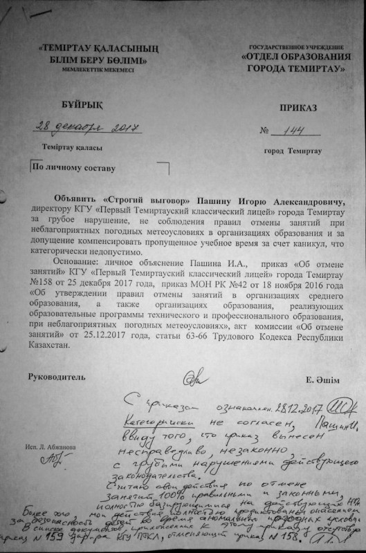"Согласно приказу министра образования и науки от 18 января 2017 года, директор школы должен был сразу оповестить об отмене занятий соответствующий орган управления, то есть нас. Игорь Александрович Пашин этого не сделал. Есть и второе нарушение. Директор компенсировал отмененные 25 декабря занятия за счет каникул. Попросту говоря, он перенес занятия на 29 декабря, время каникул. Это недопустимо. Именно за это он и получил дисциплинарное взыскание", - пояснила Айгуль Жумабаева, исполняющая обязанности заместителя руководителя отдела образования Темиртау.