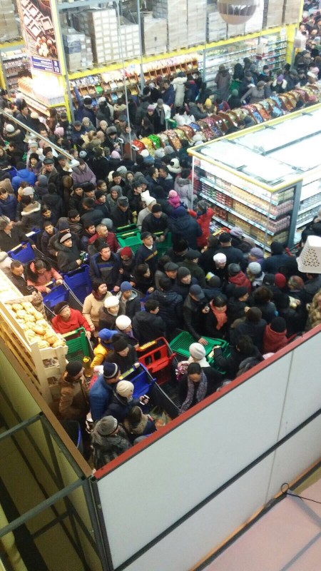 В Актобе местные жители устроили давку на открытии нового гипермаркета "Анвар" по проспекту Нокина. Кадры инцидента, который произошел в среду, 16 декабря, появились на странице zello_aktobe в Instagram.