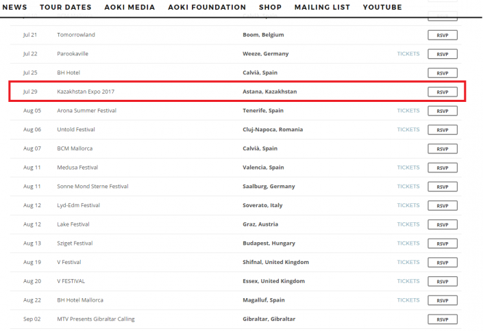 Диджей выступит с концертом в Астане 29 июля. Отмечается, что выступление намечено в рамках всемирной выставки EXPO-2017.