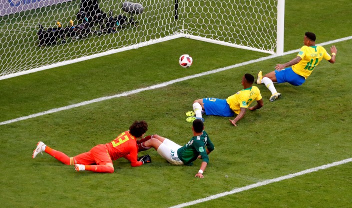 Первый гол пятикратные чемпионы мира забили на 51-й минуте матча. Виллиану прошел в штрафную ацтеков, прострелил вдоль ворот, где Неймар, воспользовавшись ошибкой Жезуса, занес мяч в пустой от голкипера угол ворот. Неймар забил свой шестой гол на чемпионатах мира и сравнялся по этому показателю с легендарными соотечественниками Бебето и Роберто Ривеллино.