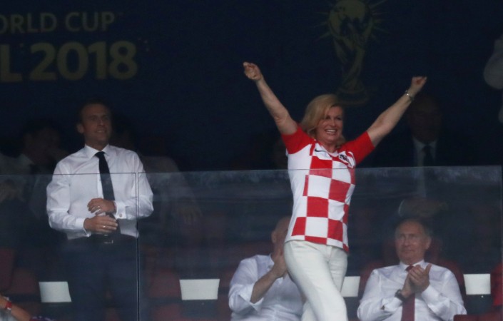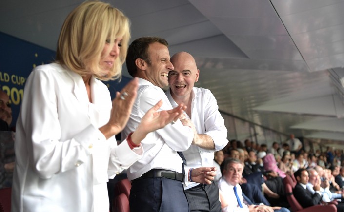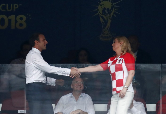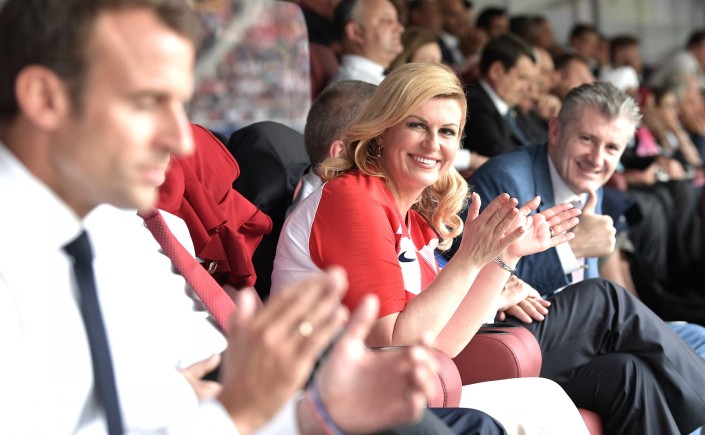 Президент Франции Эммануэль Макрон и президент Хорватии Колинда Грабар-Китарович на финальном матче чемпионата мира по футболу