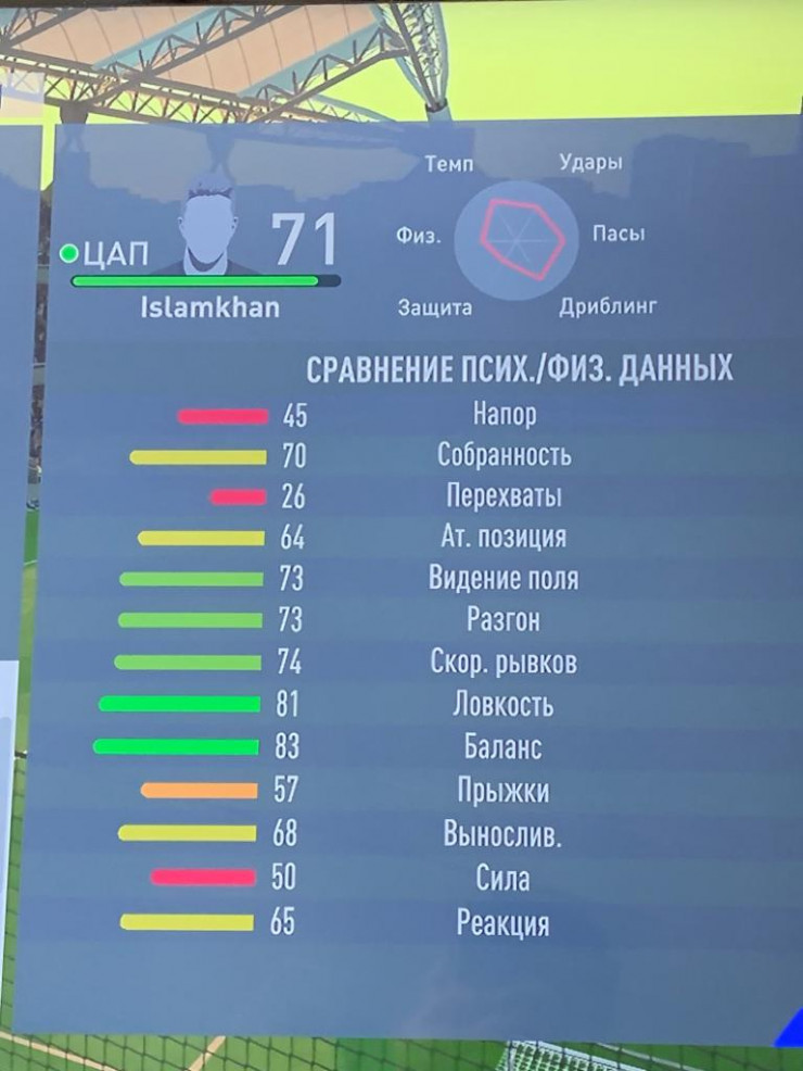 Рейтинг футболиста, или уровень его игры, составляет 71. При этом потенциал Исламхана разработчики оценили в 73.