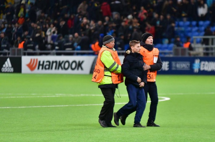 Это случилось на 88-й минуте, когда нападающий Патрик Твумаси забил второй мяч хозяев и установил окончательный счет - 2:3. Сразу четыре фаната пытались прорваться к футболистам "Астаны" и поздравить их с голом, но получилось это не у всех. Уводили нарушителей с поля представители правоохранительных органов.