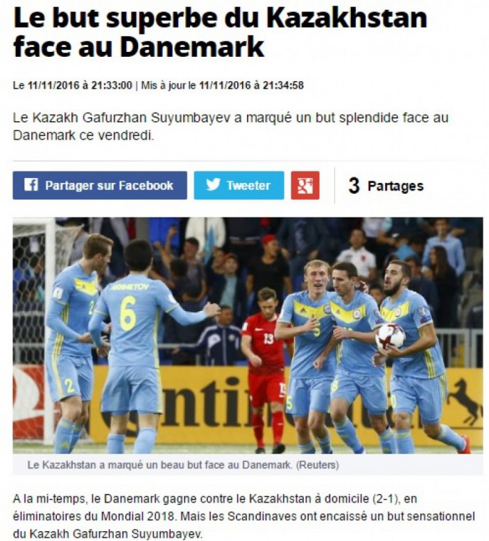 А вот как описывает гол французская газета L'Équipe: "Потрясающий гол Казахстана против Дании. Скандинавы пропустили сенсационный гол от казахстанца Гафуржана Суюмбаева".