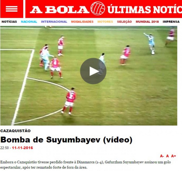 "Бомба" от Суюмбаева". Именно с таким заголовком вышла новость на сайте португальской газеты A Bola. "Хотя Казахстан проиграл Дании, Гафуржан Суюмбаев забил гол мощным ударом из-за пределов штрафной", - говорится в описании.