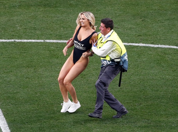 Полураздетой фанаткой оказалась американская модель Кинси Волански. Она является девушкой российского пранкера Виталия Здоровецкого. Она выбежала на поле в черном закрытом купальнике, на котором было написано Vitaly Uncensored. Так называется блог Здоровецкого на YouTube, где он выкладывает розыгрыши прохожих с полураздетыми девушками. Здоровецкий восхитился поступком Волански и пообещал, что скоро женится на ней.