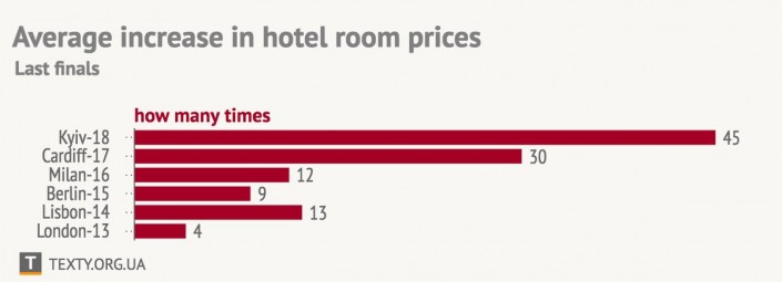 Издание отмечает, что цены на отели вырастали во всех городах, принимавших финалы. Однако столица Украины "пробила потолок".