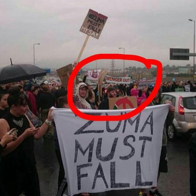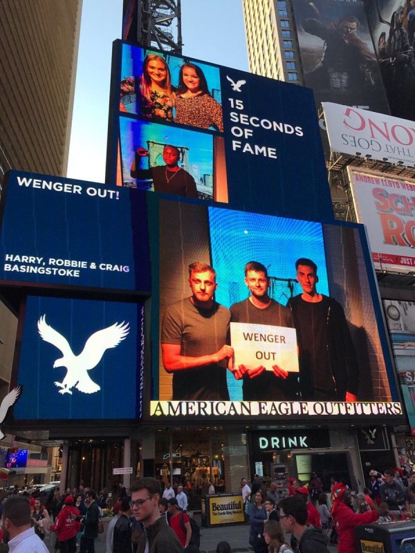 Среди держащих плакат Wenger Out можно заметить известного комментатора Евгения Акманова и ведущего программы "Наш футбол.kz" Петра Воликова.