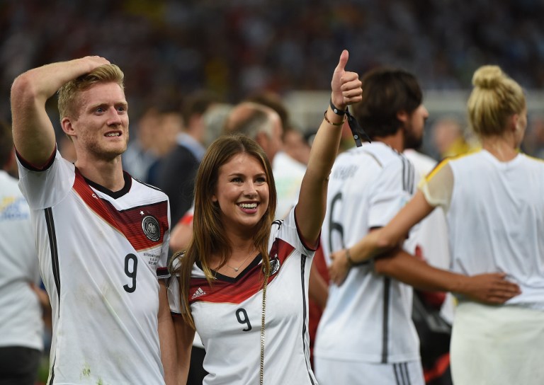 Победе сборной Германии на прошедшем в Бразилии мировом первенстве по футболу наверняка больше всего радовались самые преданные болельщики игроков, их "вторые половинки", которые поддерживали футболистов на протяжении всего чемпионата. И сразу после окончания финального матча с командой Аргентины, который завершился со счетом 1:0 в пользу немцев, жены и подруги немецких футболистов вышли на поле стадиона "Маракана" в Рио-де-Жанейро, чтобы поздравить своих мужчин с триумфом на ЧМ-2014. Да и сами игроки после поздравления товарищей по команде спешили разделить радость победы со своими спутницами жизни.