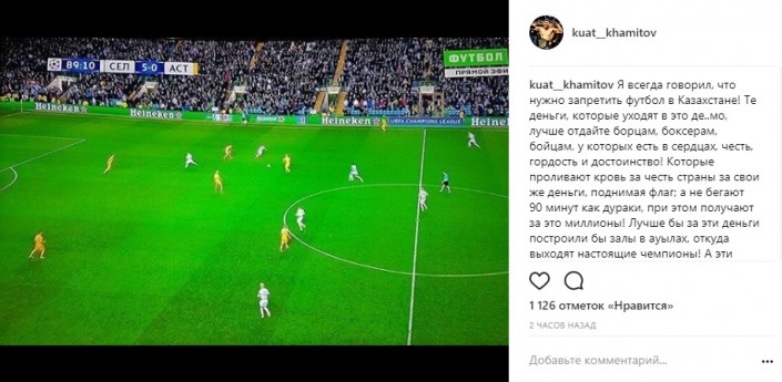 Казахстанский боец смешанных единоборств Куат "Найман" Хамитов предложил запретить в Казахстане футбол, передает Тengrinews.kz. Об этом он заявил на своей странице в Instagram после крупного поражения "Астаны" от "Селтика".