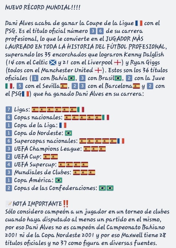 Dani Alves acaba de ganar la Coupe de la Ligue con el PSG. Es el título oficial número de su carrera profesional, lo que le convierte en el JUGADOR MÁS LAUREADO EN TODA LA HISTORIA DEL FÚTBOL PROFESIONAL.