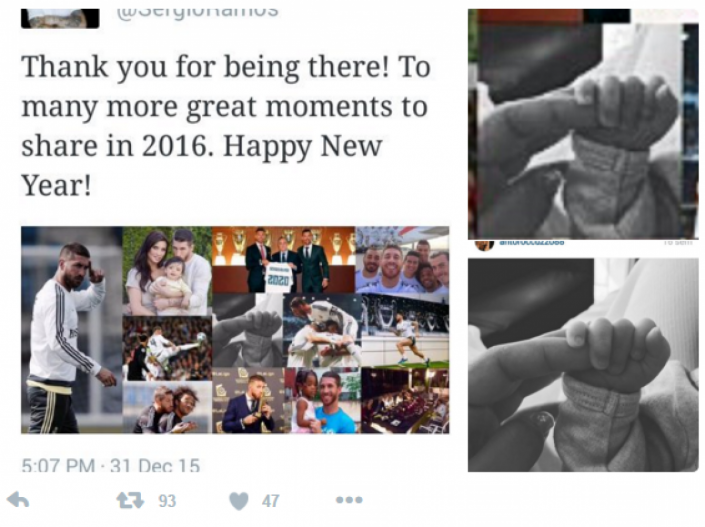 В честь Нового года Рамос опубликовал в своем Twitter коллаж с фотографиями наиболее значимых в его жизни событий в 2015 году, принесшем футболисту второго сына - Марко Рамоса. По нелепой ошибке в коллаж попала фотография из Instagram супруги Лионеля Месси Антонеллы Рокуццо. В минувшем году в семье аргентинца также появился второй сын - Матео.