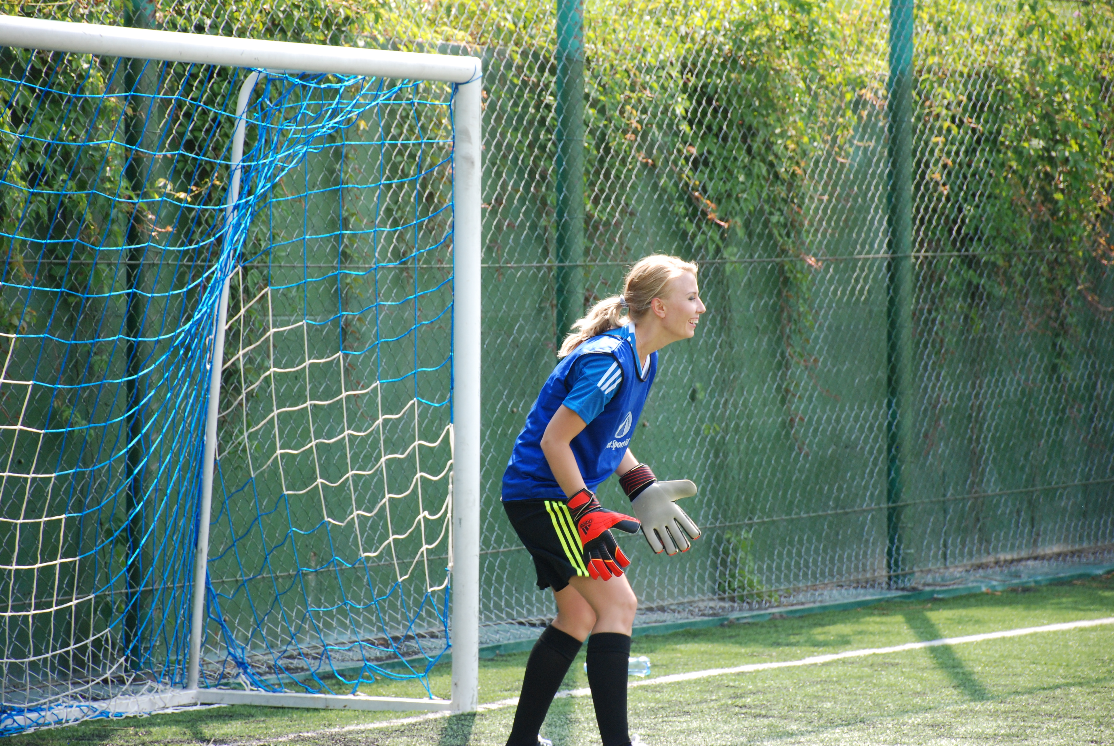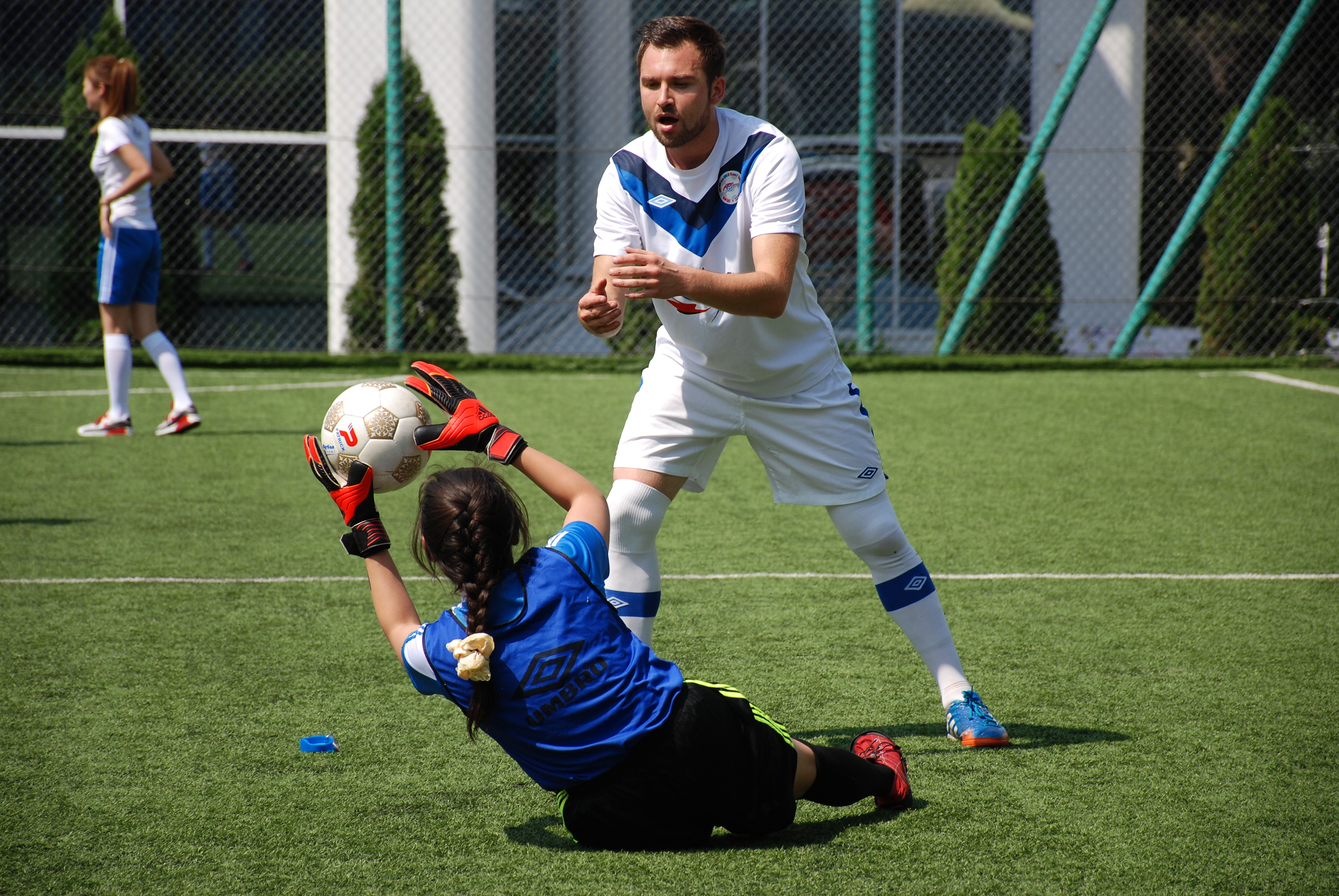 Голкипер команды журналистов Гаухар Наурызбаева с тренером перед матчем