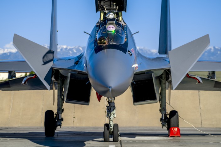 Многоцелевой сверхманевренный истребитель Су-30СМ отправляется в тренировочный полет.