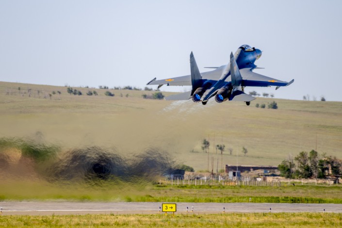 Во время учебно-тренировочных полетов пилоты набирают высоту до девяти тысяч метров. Су-30СМ поднимается на высоту 12 тысяч метров.