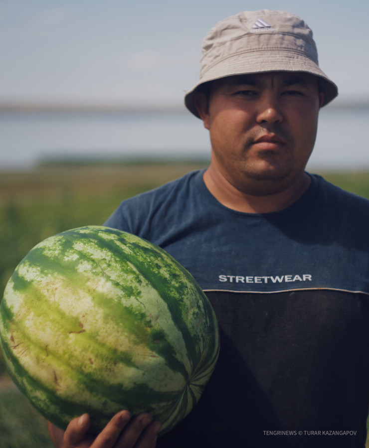 Здесь нас встретили отец и сын - Базарбай и Аян Шарапиевы. Они выращивают арбузы больше 20 лет.