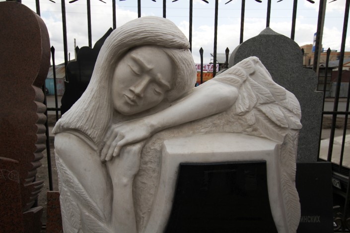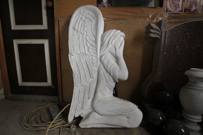 "Скульптура ангел, такие заказывают в основном для детей", - говорит молодой человек по имени Аман. У них с братом в этом районе сразу две мастерские. Одной заведует он.