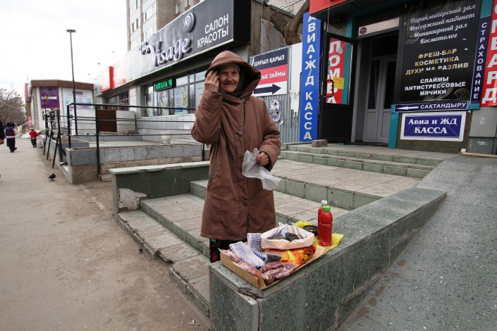 Миновав квартал с памятниками, двигаясь в сторону проспекта Республики, встречаем бабушку, торгующую разной мелочью.