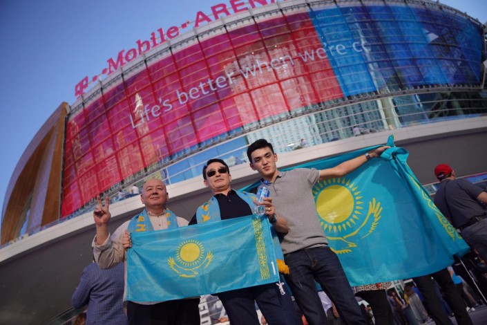 Перед началом боя у арены T-Mobile в Лас-Вегасе собирается множество болельщиков. Повсюду можно было увидеть казахстанский флаг.