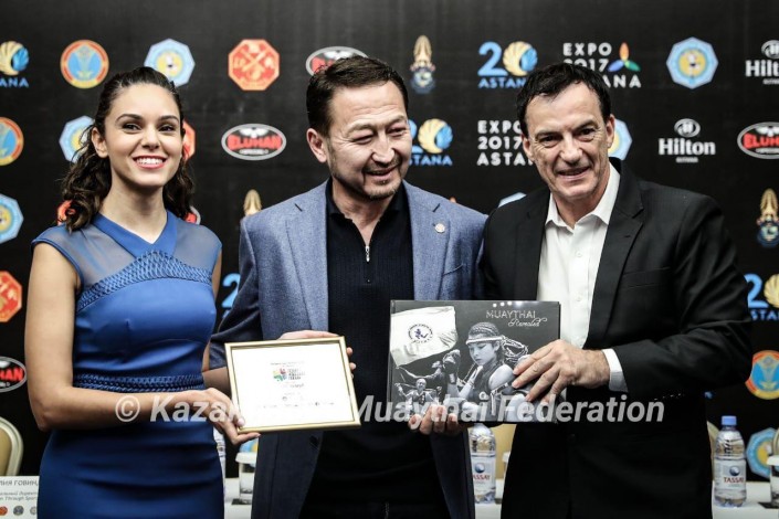 Генеральный директор United Through Sport Джулия Говиндер, вице-президент Федерации муайтай Казахстана Фархат Аманкулов и генеральный секретарь Всемирного совета муайтай (WMC) Стефан Фокс