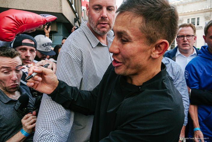После открытой тренировки Геннадий Головкин раздал фанатам автографы. Он оставлял свою подпись на футболках, головных уборах и фотоснимках. Охотно делал селфи.