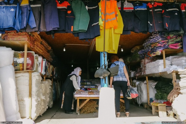 Проходя между торговых рядов, мы с фотографом то и дело замечаем продавцов с пластмассовыми стаканами, полными чая с молоком. Горячие напитки и бутерброды продает здесь семейная пара из Кыргызстана.