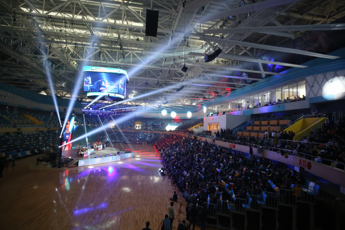 Трибуны Дворца единоборств Jekpe Jek были заполнены молодыми людьми. Это фанаты команды Syman Gaming пришли поддержать своего любимого игрока Рамазана Ramz1k Башизова.