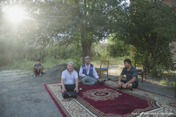 Летний вечер Карим проводит во дворе своего дома, сидя на разостланном ковре.