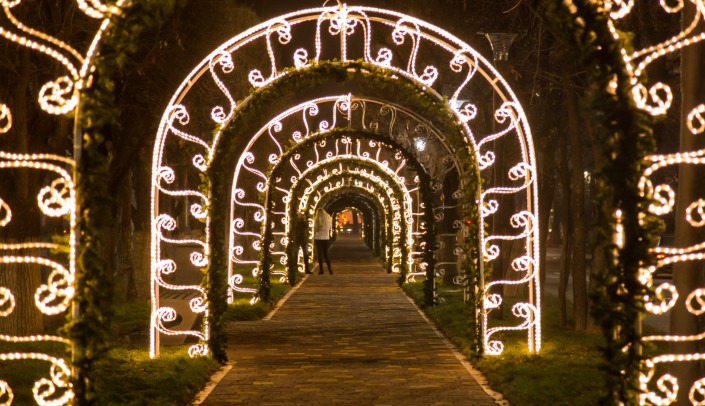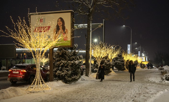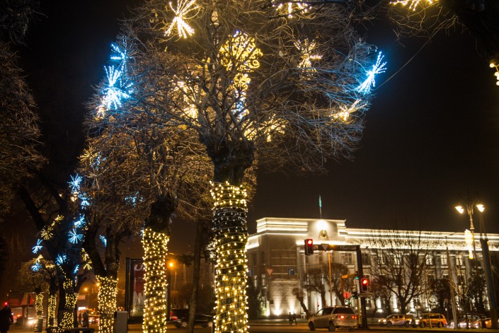 В канун Нового года Алматы засиял праздничными огнями. На улицах города появились красочные елки и необычные световые инсталляции.