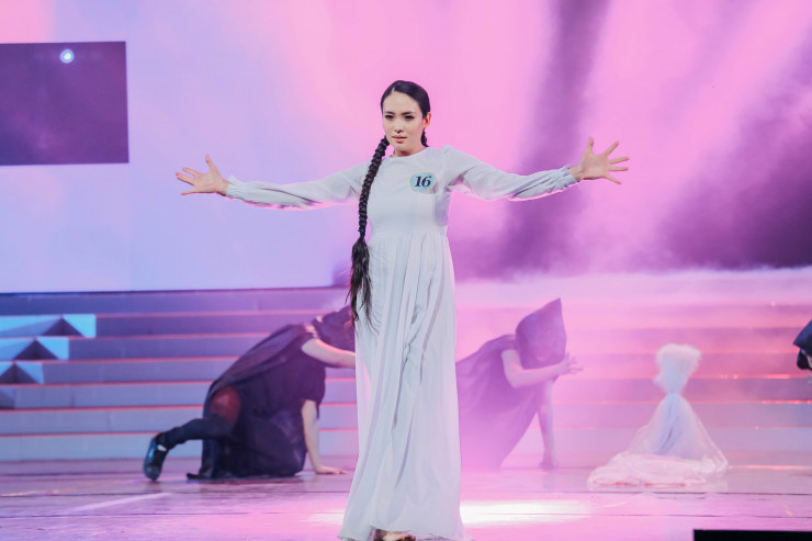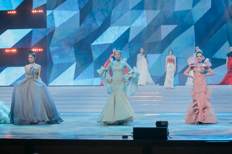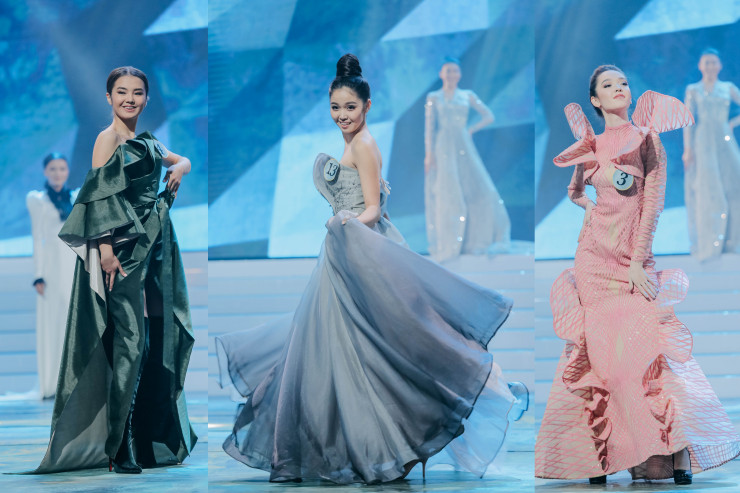 Финалистки дефилировали в нарядах от казахстанских дизайнеров.