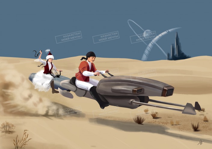 Дизайнер Акмарал Шаймагамбетова из Алматы изобразила будущий обряд "Қыз қуу". Парень и девушка вместо лошадей используют футуристические поды из "Звездных войн". "Я хочу, чтобы в будущем казахские традиции сохранились, несмотря на резкую смену обстановки и появление новых технологий", - делится девушка.