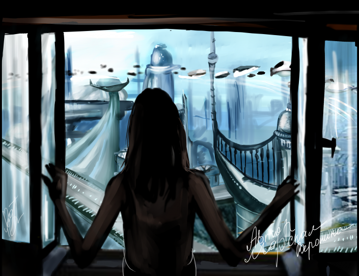 В свою очередь участница Вероника Морская прислала работу в категорию "Изобразительное искусство". На ее рисунке изображен футуристический вид казахстанского города будущего из окна. Здания выполнены в легком, воздушном стиле, в небе видны летающие машины.